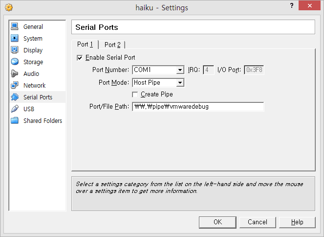 - Run Virtualbox. Select your Haiku image then click settings. Select Serial ports. Tick the tickbox “Enable Serial port” and for Port Number tick “COM1"(Because Haiku by default writes debug information to the COM1 port)