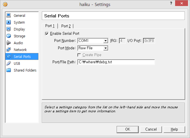 - Run Virtualbox. Select your Haiku image then click settings. Select Serial ports. Tick the tickbox “Enable Serial port” and for Port Number tick “COM1"(Because Haiku by default writes debug information to the COM1 port)