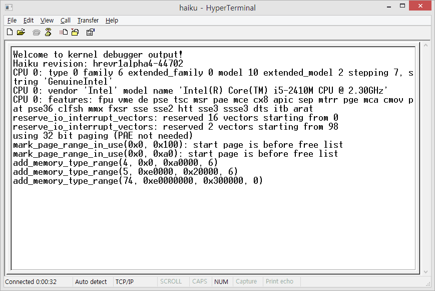 When you start your VM, it will now be debugging onto HyperTerminal.